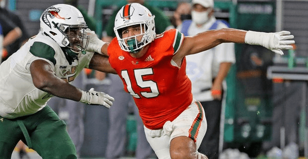 No one going through the defense wants to find themselves on the other end of Jaelan Phillips. He’s a defensive end who’s not afraid of putting his body on the line to protect the play. One of the best parts of his game is that he’s so versatile. While he’s known for his mentality on the field, he’s able to play numerous techniques and positions. At the same time, he can do it all while staying explosive. When he engages opponents, he’s always looking to finish. With that mindset, he can push his way into the backfield forcing the opponent to lose their balance and get inside pressure. With the right coaching, Phillips has all the tools to become a great professional football player.